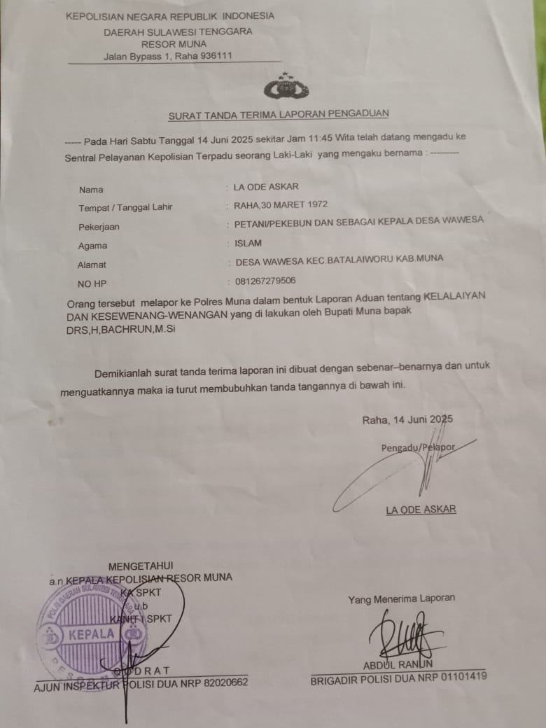 Kapolres Muna, AKBP Indra Sandy Purnama Sakti, melalui Kasi Humas Polres Muna, Ipda Baharuddin, mengkonfirmasi bahwa kasus aduan pidana terhadap Bupati Muna masih dalam proses penyelidikan.
