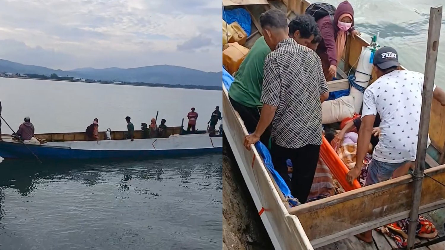 Pasien kritis dari Pulau Kabaena harus sewa perahu kayu untuk menyebrang laut menuju Kasipute Bombana. Foto: Istimewa