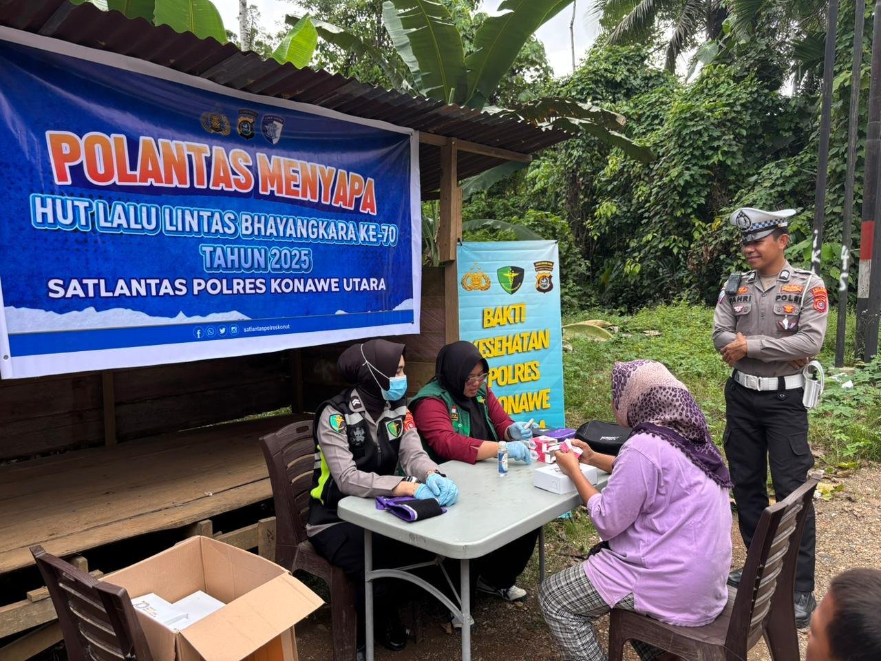 KONAWE UTARA – Dalam rangka memperingati Hari Ulang Tahun (HUT) Lalu Lintas Bhayangkara ke-70 Tahun 2025, Satlantas Polres Konawe Utara menggelar bakti kesehatan berupa pemeriksaan kesehatan gratis bagi para pengemudi yang melintas di jalur Trans Sulawesi, Kelurahan Wanggudu, Kecamatan Asera. Kegiatan ini berlangsung pada Rabu, 10 September 2025 dan berhasil menjangkau 35 orang pengemudi.