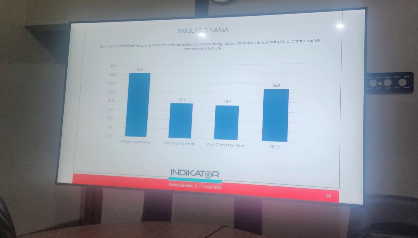 Slide bocoran survei yang diterima awak media ini, menempatkan Bakal Calon (Balon) Wali Kota Kendari, Aksan Jaya Putra (AJP) diposisi teratas dengan unggul 15 persen dari kandidat lainnya.