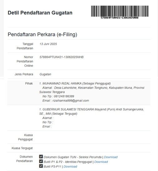 Bukti pendaftaran gugatan ke Pengadilan Tata Usaha Negara (PTUN) Kendari. Foto: Istimewa