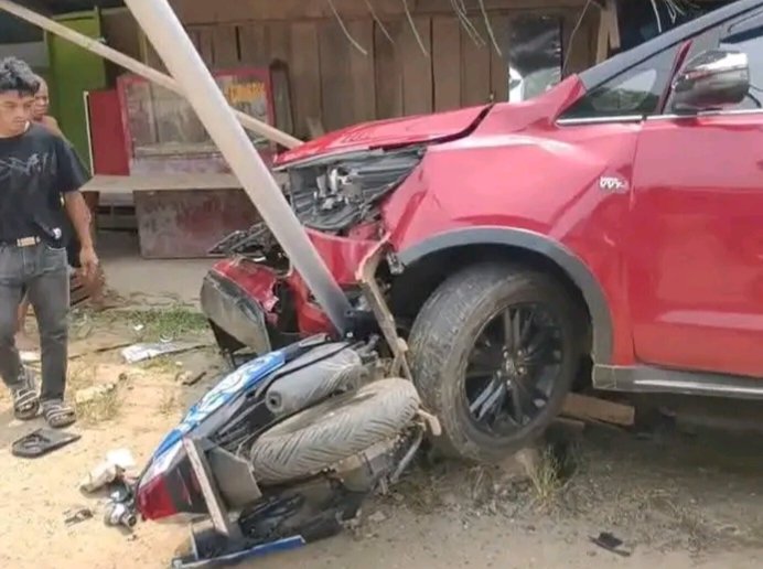 Usai benturan pertama, pengemudi mobil membanting setir ke arah kanan hingga keluar jalur dan hilang kendali. Mobil kemudian menabrak sepeda motor Honda Beat 125 DT 6638 XX yang sedang terparkir di sisi kanan jalan.