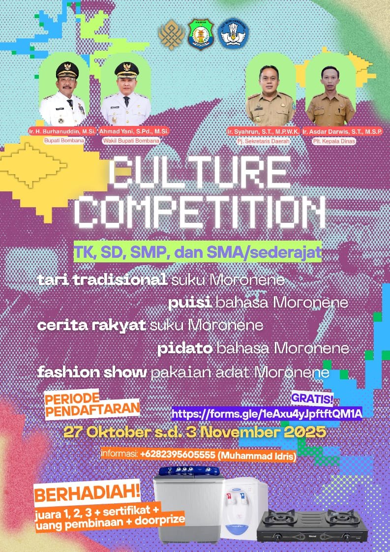 BOMBANA – Pemerintah Kabupaten Bombana melalui Dinas Pendidikan dan Kebudayaan (Disdikbud) Kabupaten Bombana akan menggelar Festival Seni Moronene Tahun 2025 dengan tema “Culture Competition” untuk tingkat TK, SD, SMP hingga SMA/Sederajat. Festival ini bertujuan untuk melestarikan budaya daerah dan mengenalkan kekayaan budaya lokal kepada generasi muda.