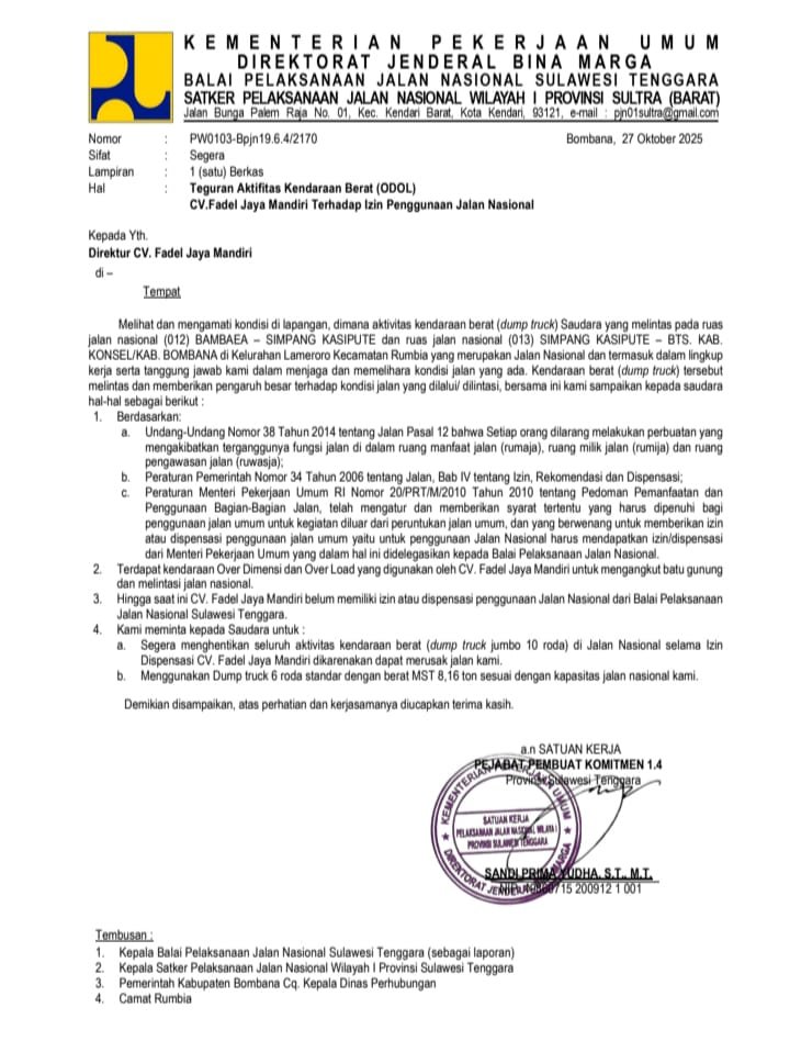 KENDARI – Balai Pelaksana Jalan Nasional (BPJN) Provinsi Sulawesi Tenggara (Sultra) mengambil tindakan tegas terhadap CV Fadel Jaya Mandiri, kontraktor proyek lanjutan Bypass-Rumbia, karena menggunakan jalan nasional tanpa izin. Aktivitas kendaraan dump truck CV Fadel Jaya Mandiri yang mengangkut material batu gamping melalui jalan nasional telah melanggar ketentuan yang berlaku.