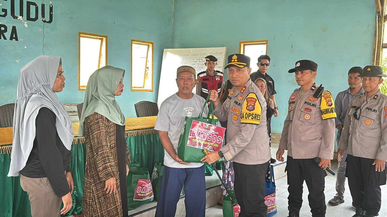 Kapolres Konawe Utara, AKBP Rico Fernanda, didampingi pejabat utama Polres Konawe Utara dan Kapolsek Asera, menyerahkan langsung bantuan sosial tersebut kepada warga yang terdampak banjir di Balai Desa Puuwanggudu dan rumah Kepala Desa Alaa Wanggudu.