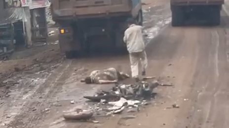 Tidak jauh dari kendaraan roda dua tersebut terlihat dua unit mobil dump truk tampak terparkir menepi di tepi jalan.