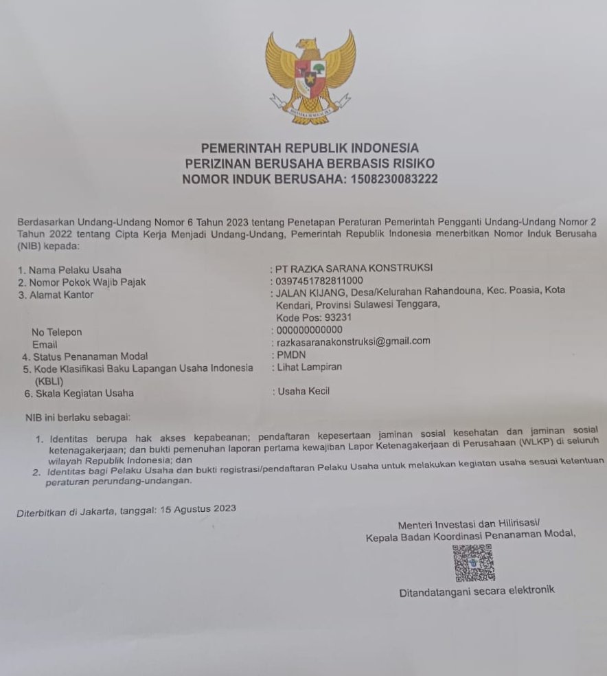 Berdasarkan penelusuran investigatif melalui Sistem OSS (Online Single Submission) serta data Nomor Induk Berusaha (NIB) yang dikelola Kementerian Investasi/BKPM, PT RSK tidak tercatat memiliki izin usaha di Kabupaten Konawe. Dokumen OSS menunjukkan bahwa perusahaan ini hanya memiliki kegiatan di Kabupaten Konawe Selatan dan Kota Kendari.