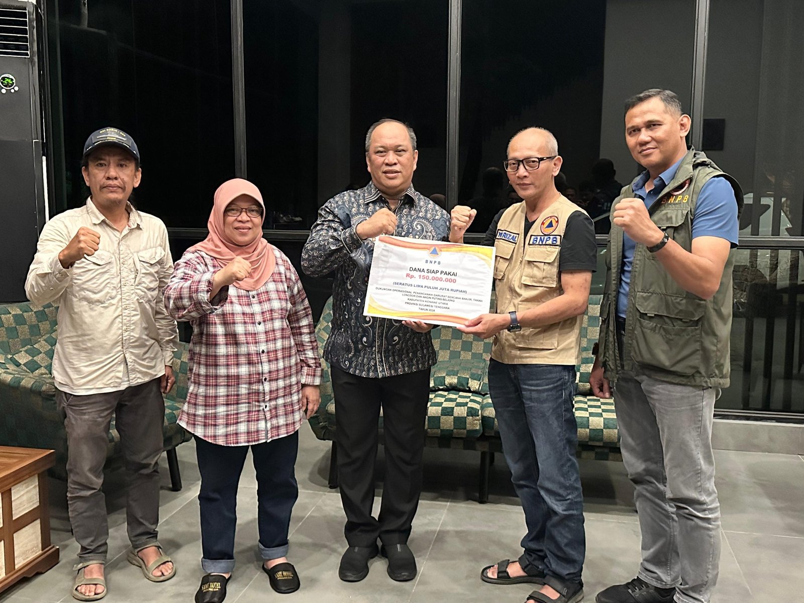 Diketahui, selain mendapatkan dana siap pakai senilai Rp150 juta, Pemda Konawe Utara juga mendapatkan bantuan dari BNPB berupa, sembako 200 Paket, makanan siap saji 200 PCS. Family Kit 200 PCS, Hyigine Kit 200 PCS, Velbed 20 Unit, Matras 200 Lembar, dan Selimut 200 Lembar.