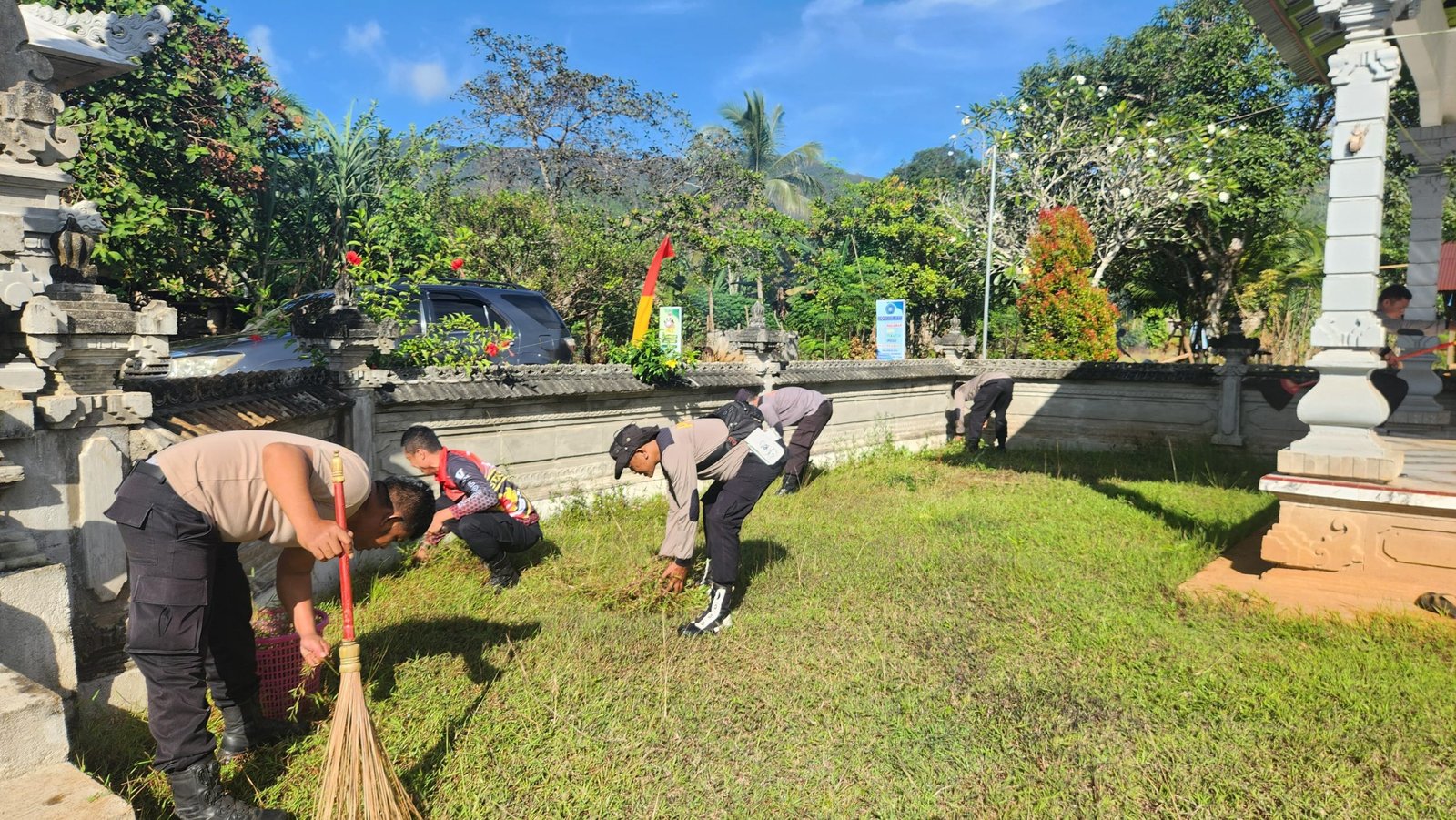 Personel Polsek Wiwirano menggelar kegiatan bhakti religi dengan membersihkan lingkungan Pura Swastirat di Desa Mekar Jaya Kecamatan Langgikima. Foto: Istimewa