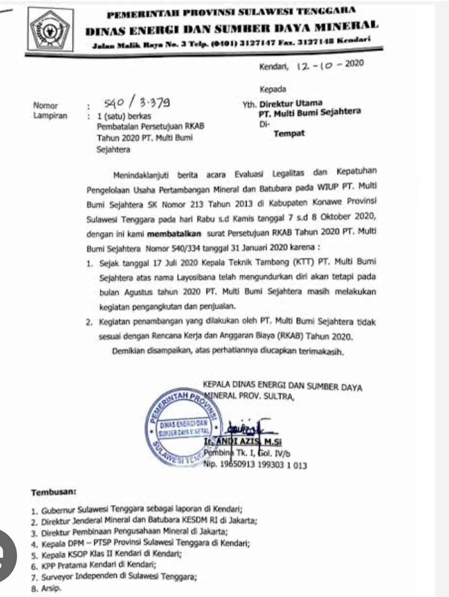 Budi Yuwono, selaku pelapor atas kerugian ore nikel sebanyak 80.000 MT, menyatakan bahwa RKAB PT MBS telah dicabut pada tanggal 12 Oktober 2020, namun PT MBS masih melakukan penjualan hingga Januari 2021.