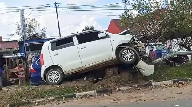 Sebuah mobil Suzuki Karimun bernomor polisi DT 1720 AD dilaporkan menabrak tiang lampu jalan di lokasi kejadian.