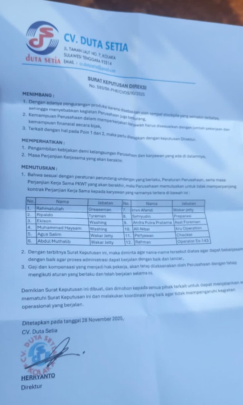 CV DS merupakan kontraktor mining IUP PT Bumi Konawe Abadi di Kecamatan Motui, Kabupaten Konawe Utara. Pada 28 November 2025, perusahaan mengeluarkan Surat Keputusan Direksi No. 593/SK‑PHK/CVDS/XI/2025 yang menyatakan 12 pekerja PKWT tidak diperpanjang kontraknya. Dalam konsideran SK tersebut, perusahaan menjanjikan bahwa gaji dan kompensasi akan tetap dibayarkan sesuai aturan yang berlaku.