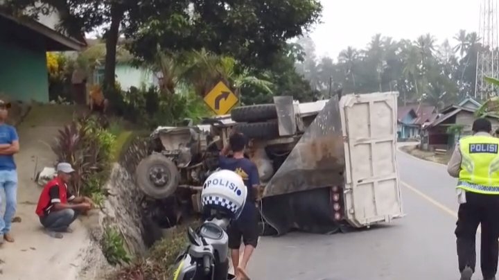 Berdasarkan rekaman video yang diterima penafaktual.com terlihat mobil truk berwarna putih itu terbalik membentang di sisi kiri jalan.