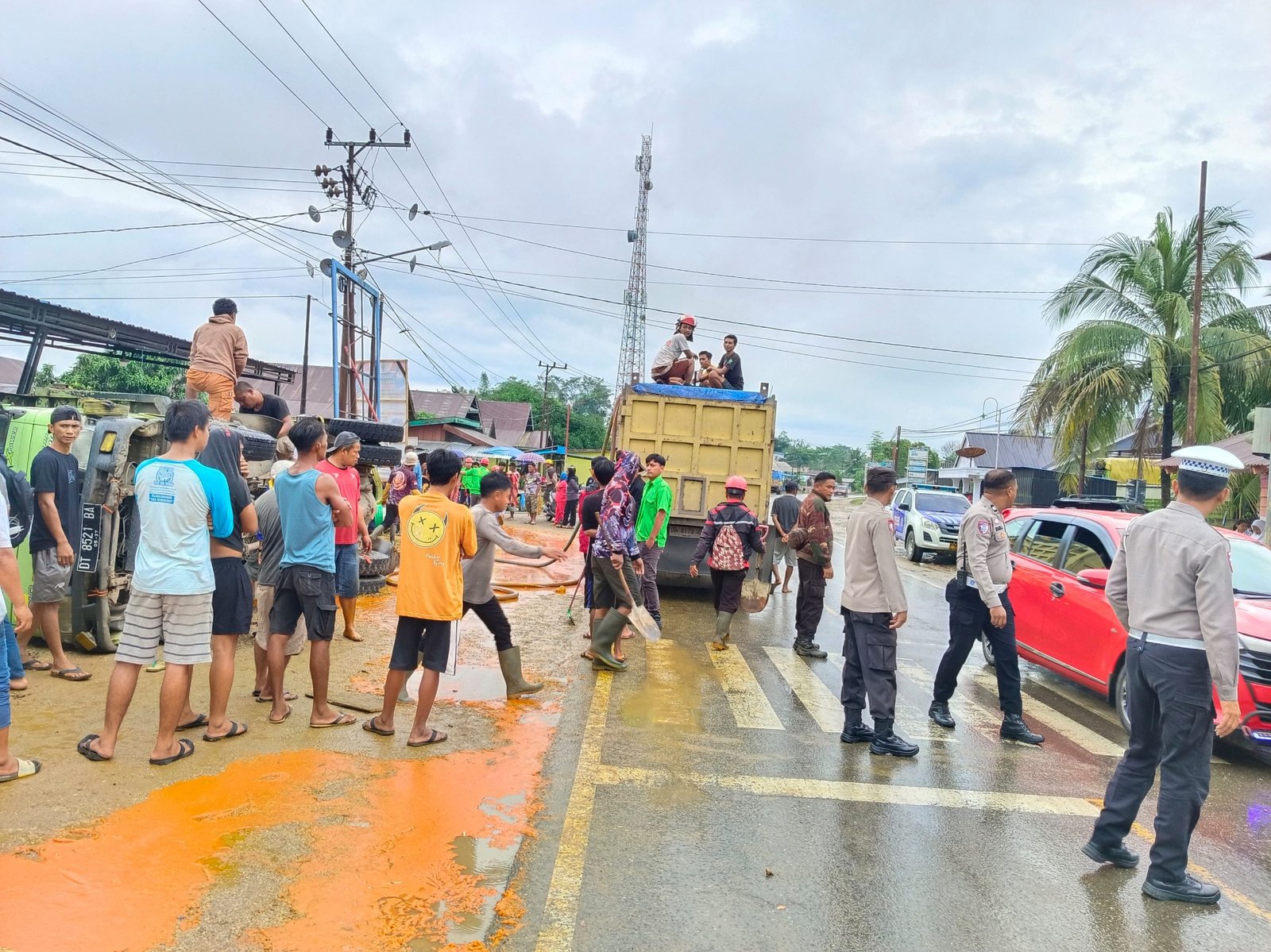 Petugas kepolisian bersama warga langsung melakukan evakuasi dan membersihkan tumpahan CPO yang membahayakan pengendara lain.